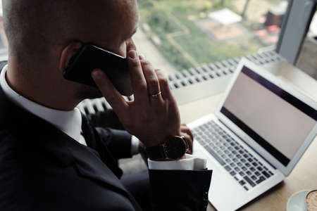 A business man surprised businessman in an attractive European-looking suit works in a laptop, talks on a cell or mobile phone, sitting at a table in a cafe by the window.