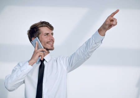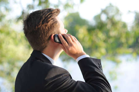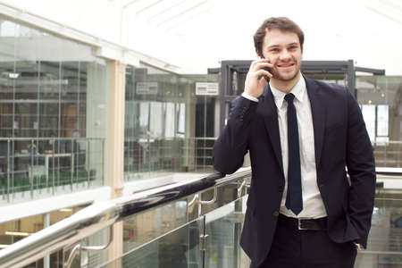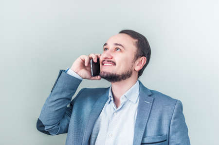 Young attractive businessman talking by mobile phone and looking at viewer.
