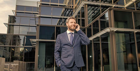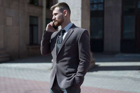elegant handsome man in suit having a nice conversation on cellphone with someone clouse or with his wife, outside next to an office building