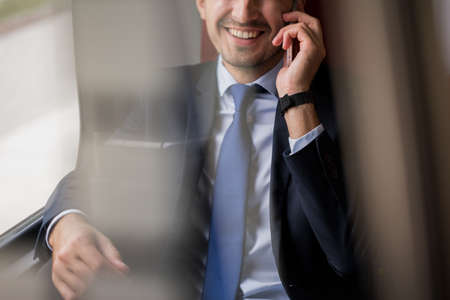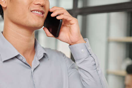 Cropped image of positive young entrepreneur smiling when talking on phone with business partner