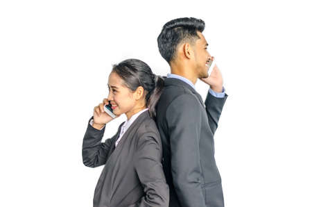 two business colleagues in suit use phone for negotiation isolated on white, online communication