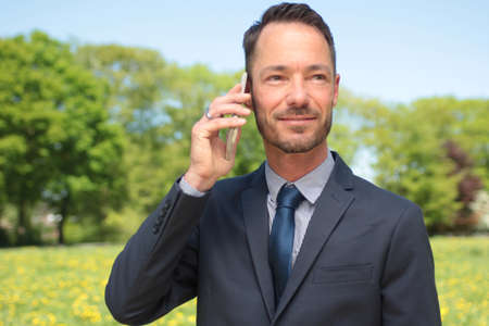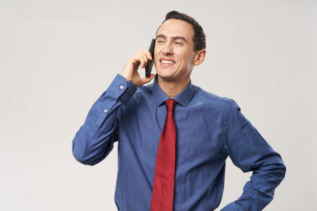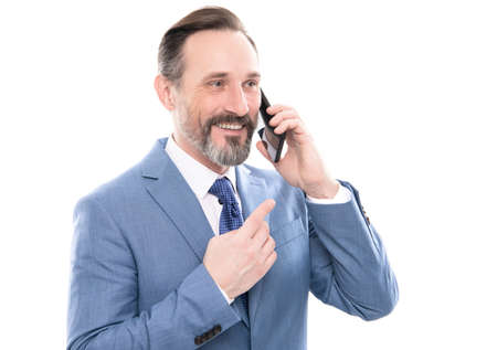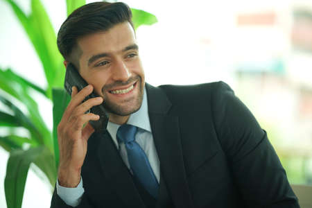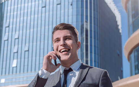 phone call. mobile connection technology. communication. glad businessman speak on smartphone