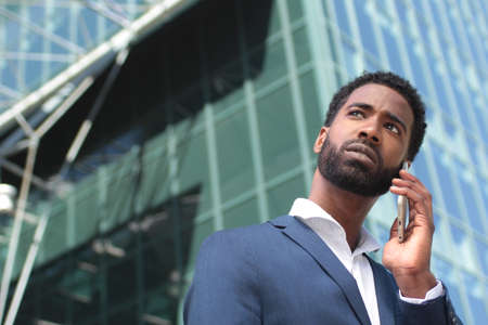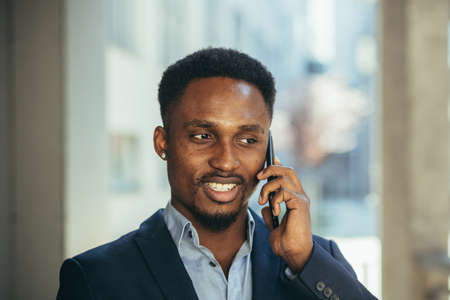 close up portrait of african businessman talking on the phone and smiling from success in business suit