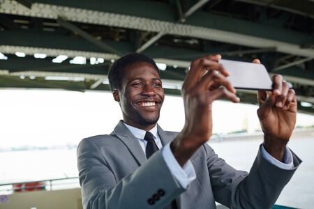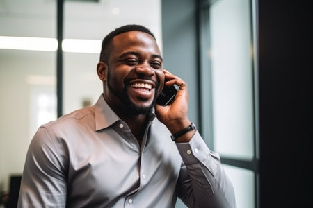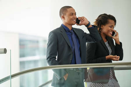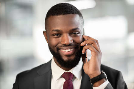 Close-up portrait of young African American manager talking on smartphone and smiling cheerfully on business center background