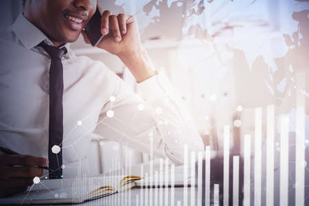 Unrecognizable young African American businessman talking on smartphone in blurry office with double exposure of world map and graph. Toned image. Elements of this image furnished by NASA