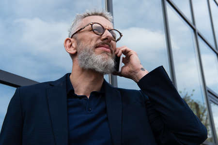 middle aged businessman in glasses with gray hair talking on smartphone near building
