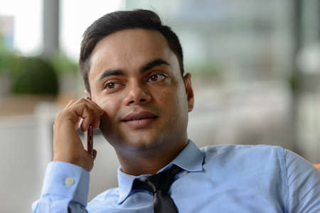 Headshot of smiling indian businessman in smart casual shirt talking on the smartphone and looks at the camera, eastern man has pleasant phone conversation