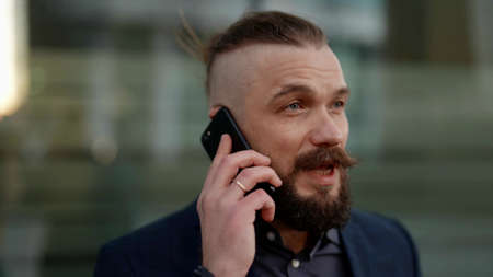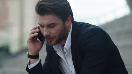 Closeup serious businessman talking on smartphone at city street. Confident entrepreneur having conversation on cellphone in modern city. Handsome business man using mobile phone outdoors