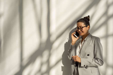 Happy young Asian businesswoman speaking on mobile phone against white wall