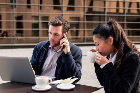 successful young business people talking with smart phone and drinking tea during coffee break. close up side view photo