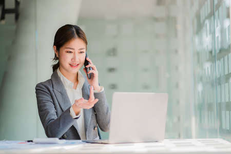 Asian business woman working in finance with laptop and smartphone, accounting concept.