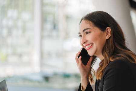 Beautiful asian woman businesswoman walking near the office, talking on the phone in a business suit