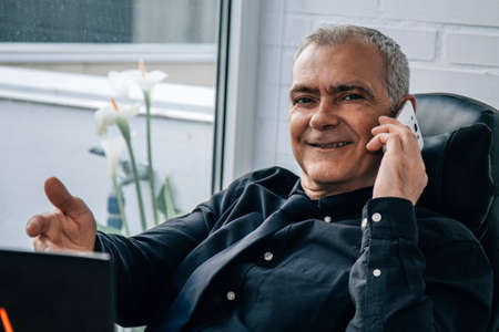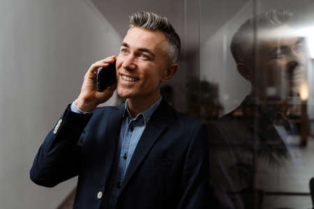 Smiling grey man talking on mobile phone while leaning on wall in office