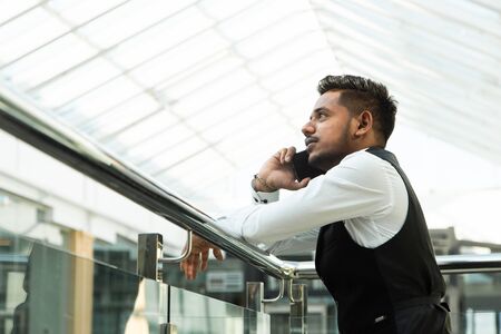 Graphic wide angle portrait of successful Middle-Eastern businessman speaking by smartphone while standing on balcony in luxurious hotel, copy space