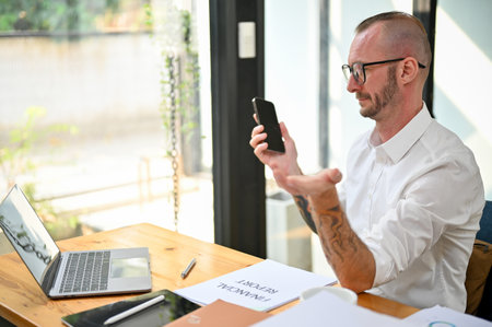 Confused Caucasian businessman or male financial office worker working on financial report at his desk, holding a smartphone and looking at laptop screen.