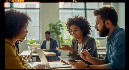 A group of diverse business professionals engaged in a lively discussion during a meeting in a modern office.