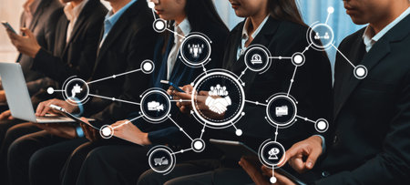 HR human resources management concept corporate organisation structure mixed media double exposure virtual screen.