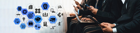 Group of business colleagues working on technology at business process to achieve tremendous growth in commerce. Worldwide process to conduct transactions.