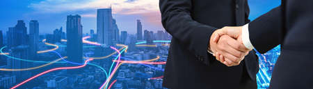 Double exposure of handshake between businessman with speed line glowing light trail surrounds the Smart city - Business success agreement, Immovable property concept. panoramic banner