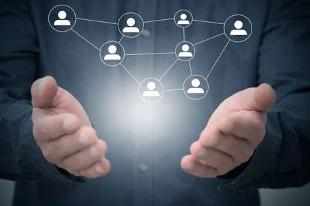 Business network web banner photo set in concept of management and growth by using corporate teamwork and people networking skills .