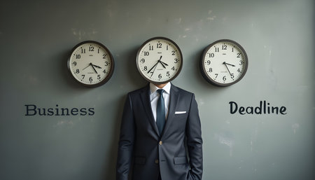 A suited professional stands in front of three wall clocks that display different times. The clocks symbolize the pressures of business deadlines and the importance of effective time management.