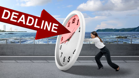 Asian businesswoman tries to hold back the deadline arrow with a clock on the street