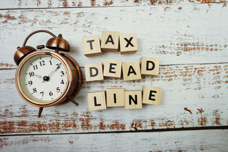 Tax Deadline with alarm clock with space copy on wooden background
