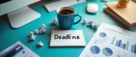 A cozy workspace features a blue coffee cup next to a note that boldly states Deadline, surrounded by crumpled paper and analytical reports. This scene captures the essence of productivity and the pressure of meeting deadlines, evoking a sense of urgency and focus.