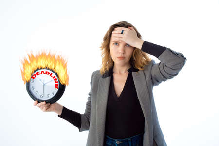 Deadline, procrastination. A shocked woman holds a burning clock. Isolated on a white background
