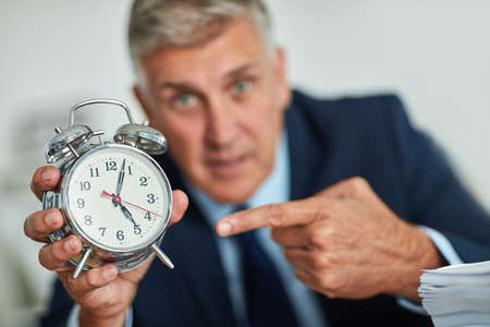 The clocks ticking. Portrait of a mature businessman gesturing toward a clock in frustration.