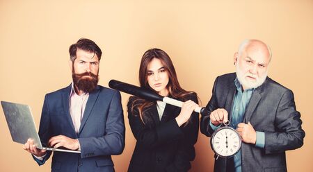 Business strategy. Aggressive business. Expert team. Men bearded manager show financial report laptop. Woman and guy colleague working together. Business lady and boss. Time demands decisive actions