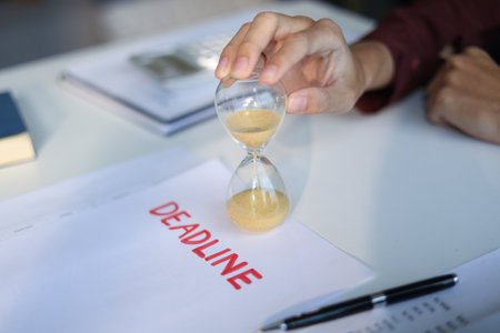 Male employee sitting on office desk holding running sand clock and Deadline paper on the table. Time management concept.