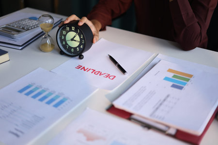 Businessman working on office desk, holding clock with deadline document and running sand clock on the table. Time management concept.