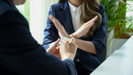 A professional and successful female lawyer or businesswoman refuses money or bribe from her business client. cropped image