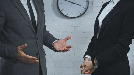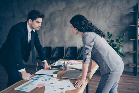 Waist up portrait of business people while standing at the office wood desk and looking each other