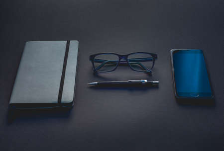 Glasses and pen next to a gray notebook and smartphone are on a black background