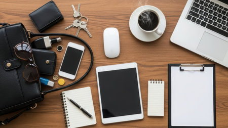 Top view of business workplace with digital tablet, smartphone, notebook and stationery