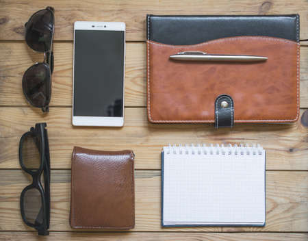 mans set background: smartphone, Sunglasses, pen, wallet and notepad