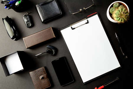 Top view of office desk with mock-up paper, eyeglass, pen, smartphone, key, wallet, agenda, cactus, stapler, audio headset, notes block on black background.