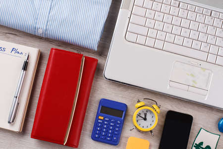 Business office Desk with laptop, phone and tablet. Well organized workspace with office supplies and stationery