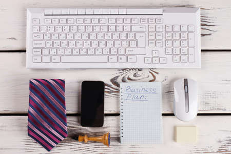 Stationer, money and tie. Office worker flatlay. Details of busy person.
