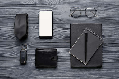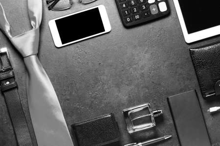 Mens accessories on a black concrete background. The concept of a successful modern man