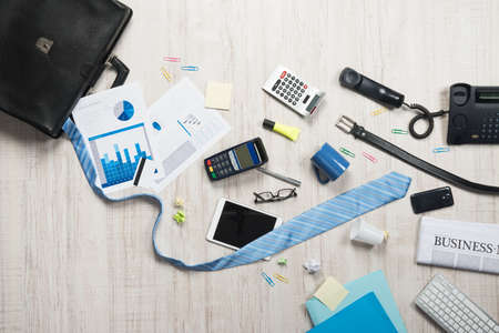 Businessman briefcase with paperwork and accessories on the floor, business failure concept.
