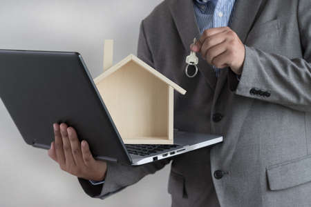 Real estate brokerage agent Deliver a sample of a model house to the customer, mortgage loan agreement Making lease and buy and sell house And contract home insurance mortgage loan concept