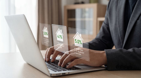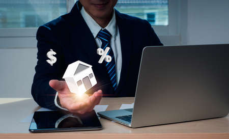 The percentage icon is held by the businessman, and the home sign is displayed on the virtual screen. Mortgage payments and interest reduction, taxation, savings, and planning
