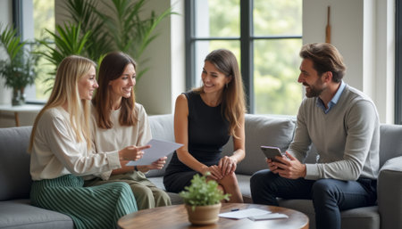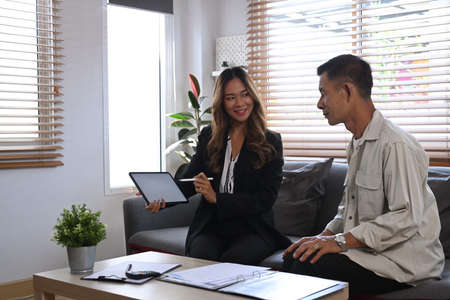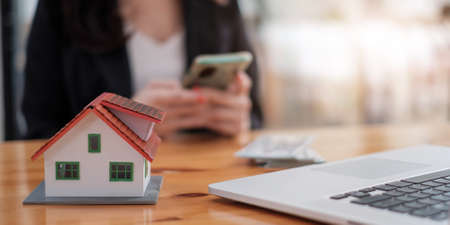 Close up of Businesswoman and customer pointing and using smartphone for buying house. Bank manager concept.