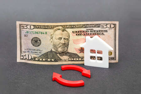 Home loan / reverse mortgage or convert assets to cash concept : house model on stack of US dollars coins, EU banknotes Picture the homeowner or the borrower turning the property into cash.