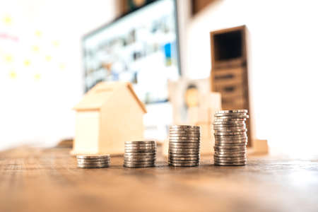 Stacked of Coins and house model , graph ,glasses and laptop, investment concept.