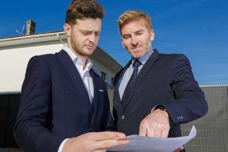Businessmen holding pens, signing home titles with insurance, care about real estate services and the idea of real estate agents offering interest in installments to their customers.