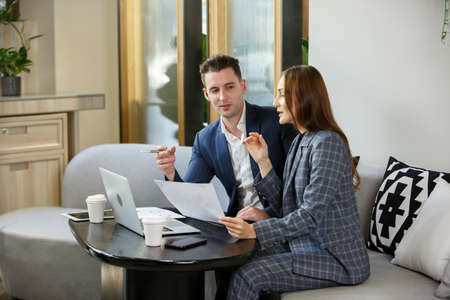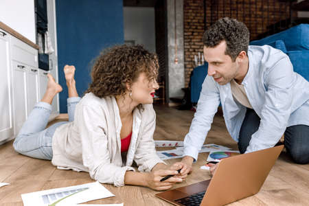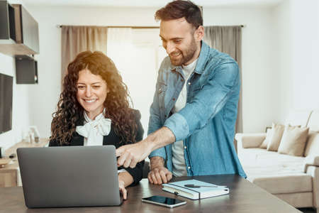Stylish business partners are working on a project at home in the kitchen, discussing ideas. Happy colleagues studying financial charts, using laptop, talking about new strategy, smiling. business.